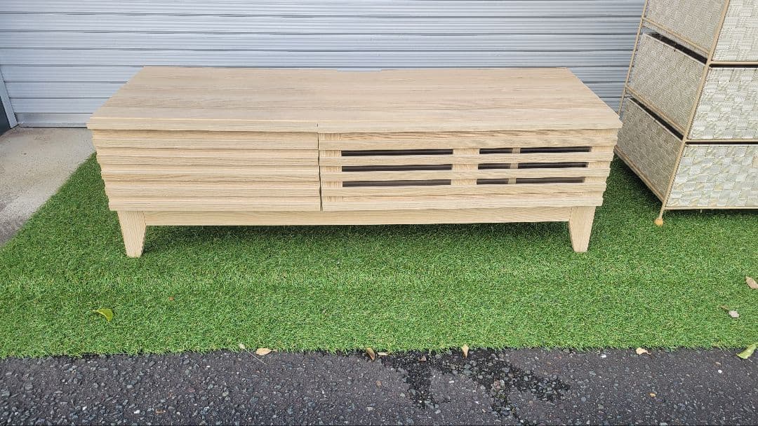 無印良品(MUJI)のオーク材テレビボード・AVラック(幅150cm)です。ナチュラルなオーク材の風合いと、どんなお部屋にも合わせやすいシンプルデザインが特徴の人気シリーズです。\r\rスライド扉付きで見せたくない機器や小物をすっきり隠して収納でき、薄型ローボードなのでお部屋を広く見せてくれます。高さも低めで圧迫感が少なく、大型テレビとの相性も良いサイズ感です。\r\rカラーは明るめのオーク(ナチュラル系)で、北欧テイストや無印良品らしいシンプルインテリアがお好きな方におすすめです。現行品では手に入りにくいデザインで、中古市場でも需要のあるモデルです。\r\r【サイズ(品質表示より)】\r幅1500 × 奥行350 × 高さ365mm\r※採寸には多少の誤差がある場合があります。\r\r【素材】\r天板・前扉・側板・脚部:オーク材突板を使用した繊維板(ウレタン樹脂塗装)\r内部:パーティクルボード、ブナ材など\rしっかりとした作りで、重量のあるテレビやAV機器の設置にも安心感があります。\r\r【状態】\r全体的に使用に伴う小キズ・スレ・日焼け・細かな汚れなどはありますが、使用上大きく目立つダメージはなく、まだまだお使いいただけるコンディションだと思います。天板や前面の状態は写真でできるだけわかりやすく掲載しておりますので、必ずご確認ください。\r\r【機能・仕様のポイント】\rスライド扉でホコリを防ぎつつ、リモコン操作もしやすいデザイン\rテレビやレコーダー、ゲーム機、DVDなどをまとめて収納できる大容量\r背面に配線を逃がしやすい構造で、コード類もすっきりまとめやすいです。\r\r【発送について】\r梱包・発送たのメル便(250サイズ・送料8,600円込み)でお届けします。プロの業者さんが梱包から搬出・搬入まで対応してくれるため、大型家具でも安心・安全にお受け取りいただけます。\r\r【最後に】\rこちらはあくまで中古品です。使用に伴う小さなキズや細かな汚れがある前提でご検討ください。写真では写しきれない部分もありますので、気になる点はお気軽にコメントよりご質問ください。